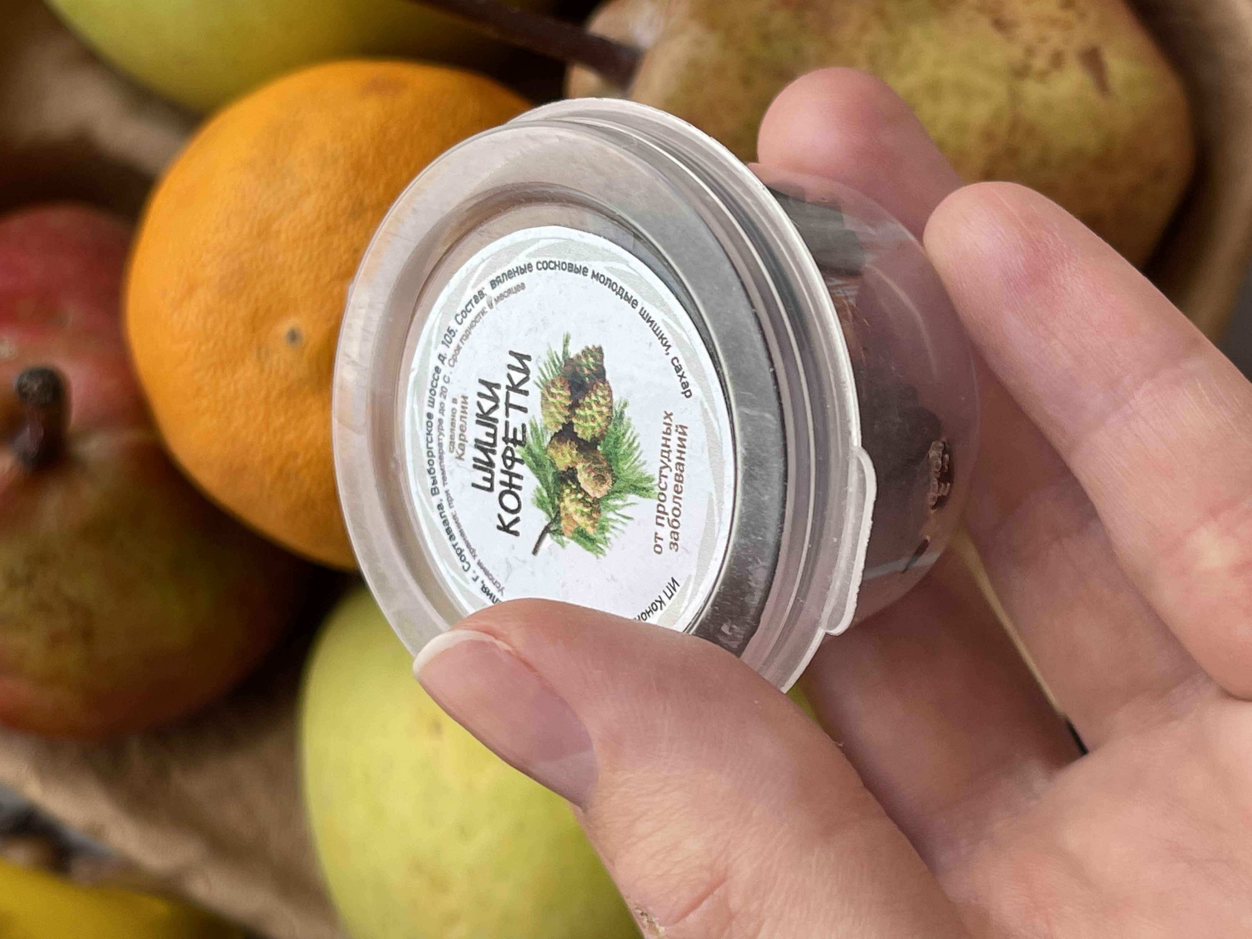 Вкусные проваренные в сиропе молодые сосновые шишки. Внутри мягкие, напоминают плотное желе. Очень полезный десерт из Карелии.